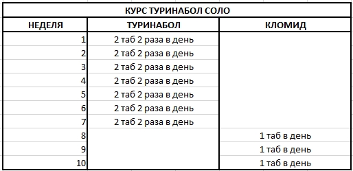 Длительность приёма соло туринабола составляет 6 недель, при этом дневная доза не должна превышать 40 мг. Таблетки принимают 2 или 3 раза в сутки. Для женщин рекомендуемая дозировка более низкая, минимальная от 2 до 5 мг, максимальная до 10 мг в день.